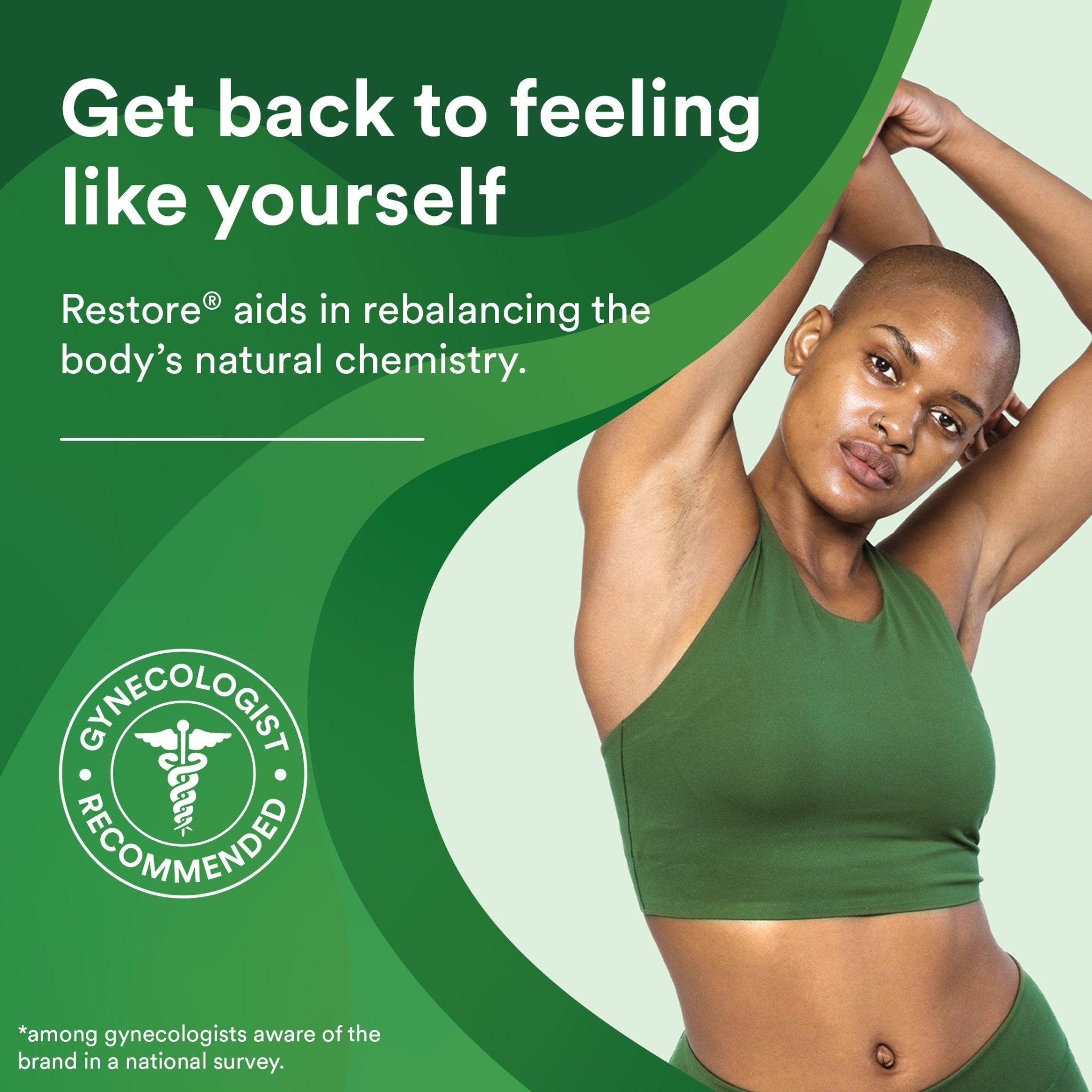 Restore Moisturizing Vaginal Gel: Use one application as needed for day-to-day comfort and moisture. Restore® can also be used for personal lubrication to enhance intimate sexual activity and supplement the body’s natural lubrication. Compatible with natural latex and polyisoprene condoms.