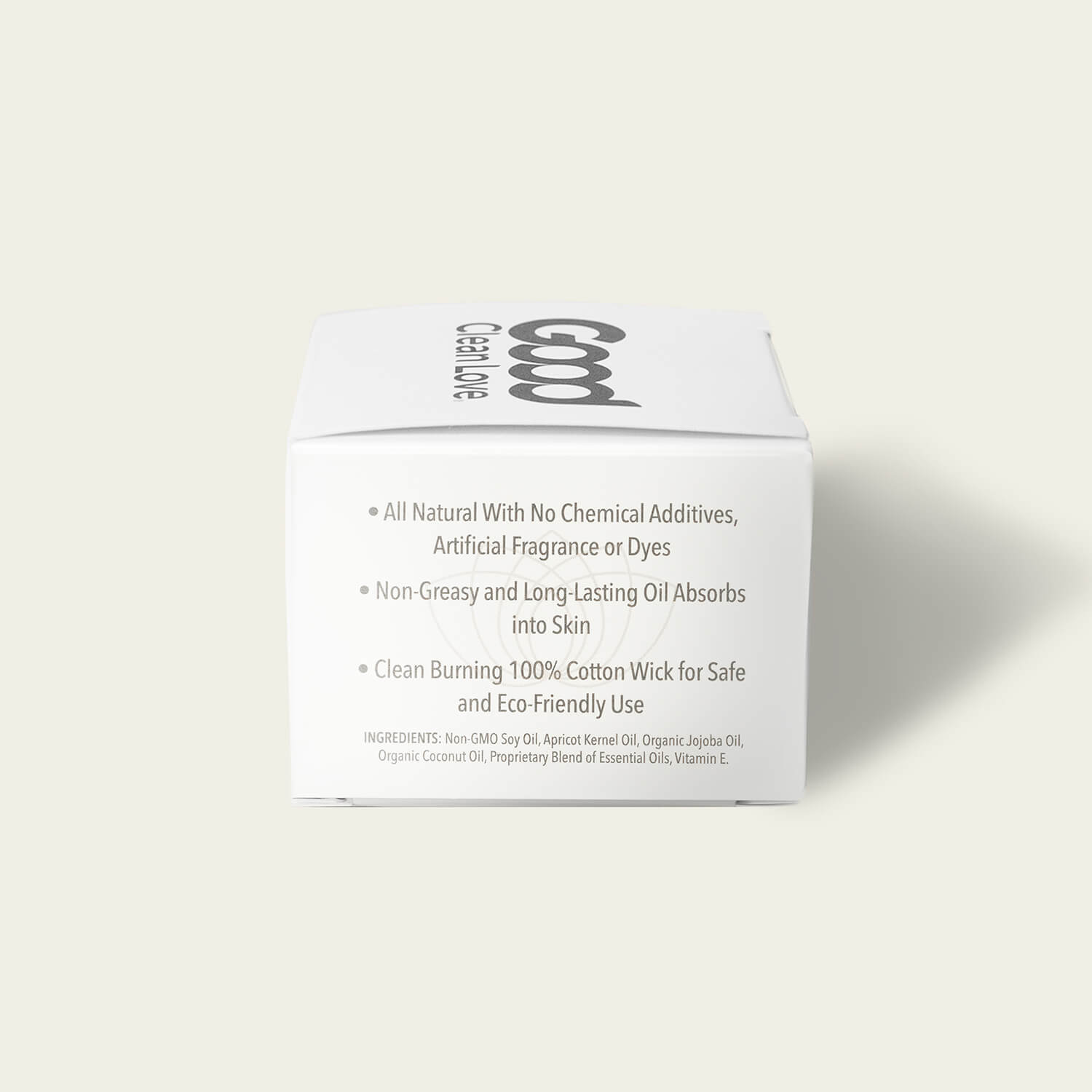 Non-GMO Soy Oil, Apricot Kernel Oil, Organic Jojoba Oil, Organic Coconut Oil, proprietary blend of essential oils, Vitamin E.