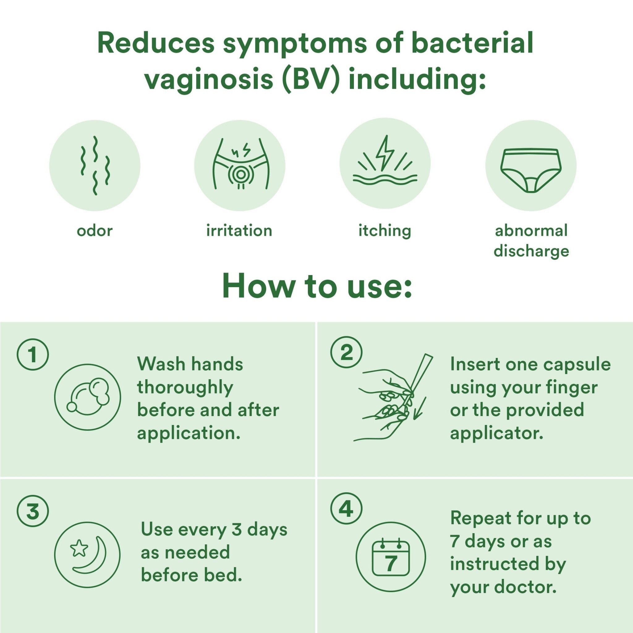 Reset Homeopathic Suppository: Wash hands before use. When the vaginal area is clean and dry, use either your finger or provided applicator to insert capsule as far as is comfortable. Adults 18 years of age and over: insert one suppository into the vagina every 3 days as needed before bedtime to relieve symptoms of bacterial vaginosis and to support vaginal flora. Under 18 years of age: consult a doctor. If using applicator: pull back plunger and place a capsule in the space in the end of the barrel. Gently insert applicator barrel into the vagina, then press the plunger. Remove applicator. Wash applicator in hot soapy water and allow to air dry. Make sure the applicator is clean and dry before reusing.
