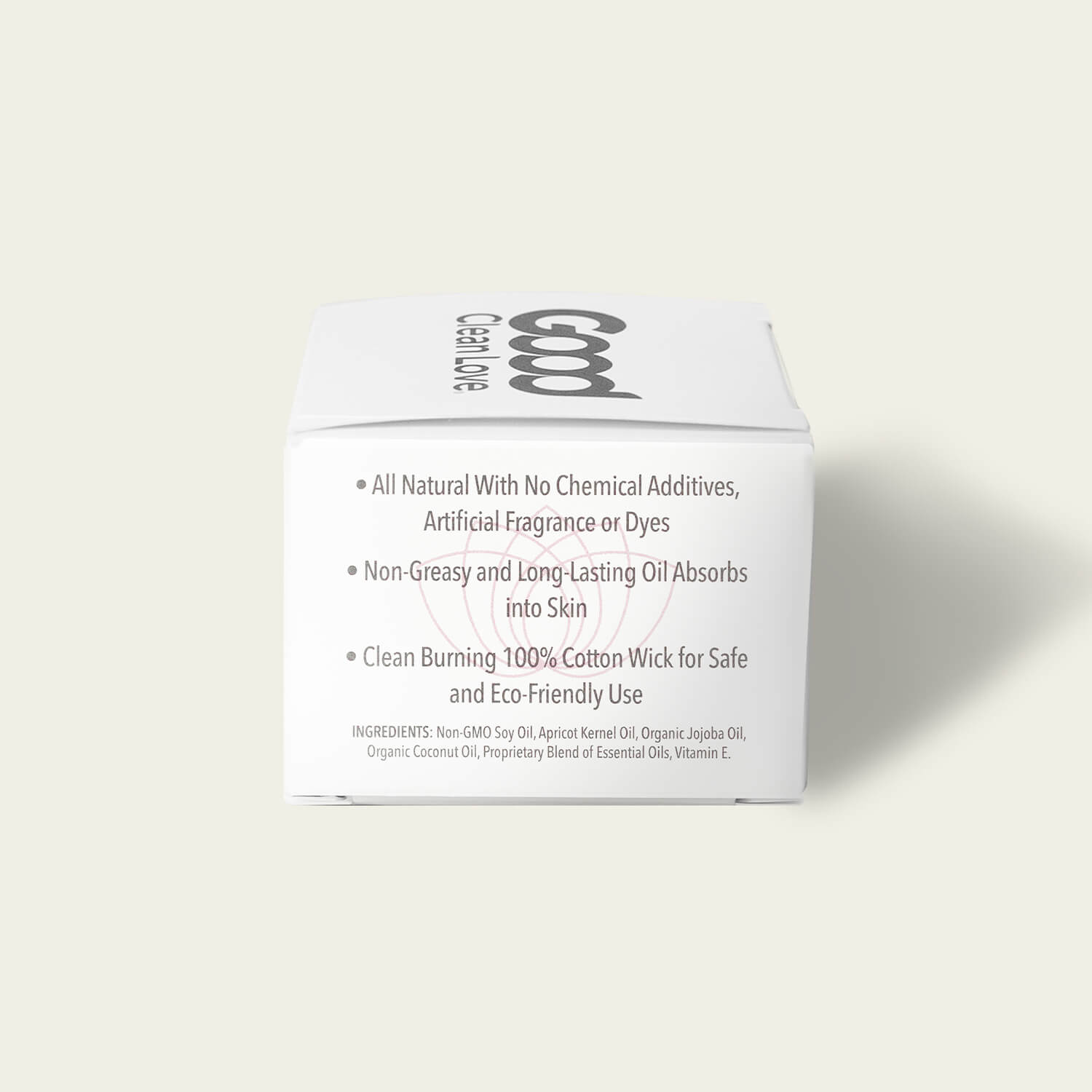 Non-GMO Soy Oil, Apricot Kernel Oil, Organic Jojoba Oil, Organic Coconut Oil, proprietary blend of essential oils, Vitamin E.